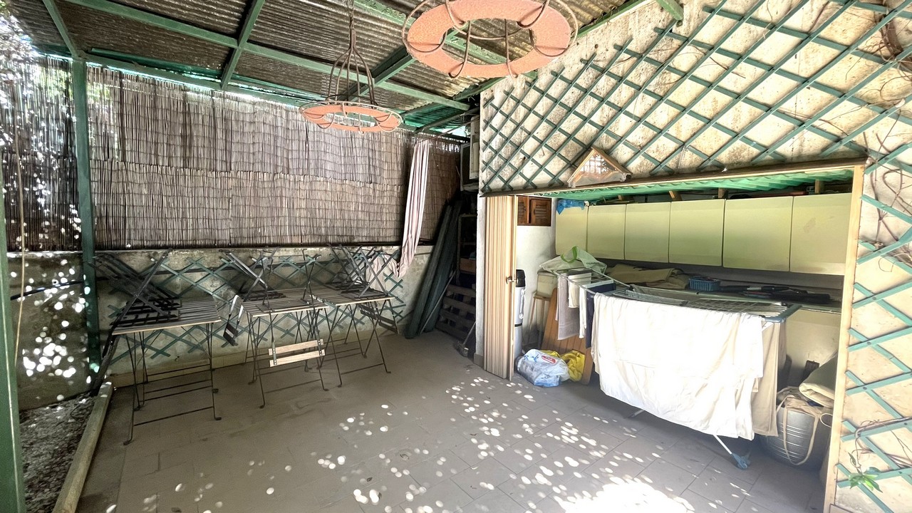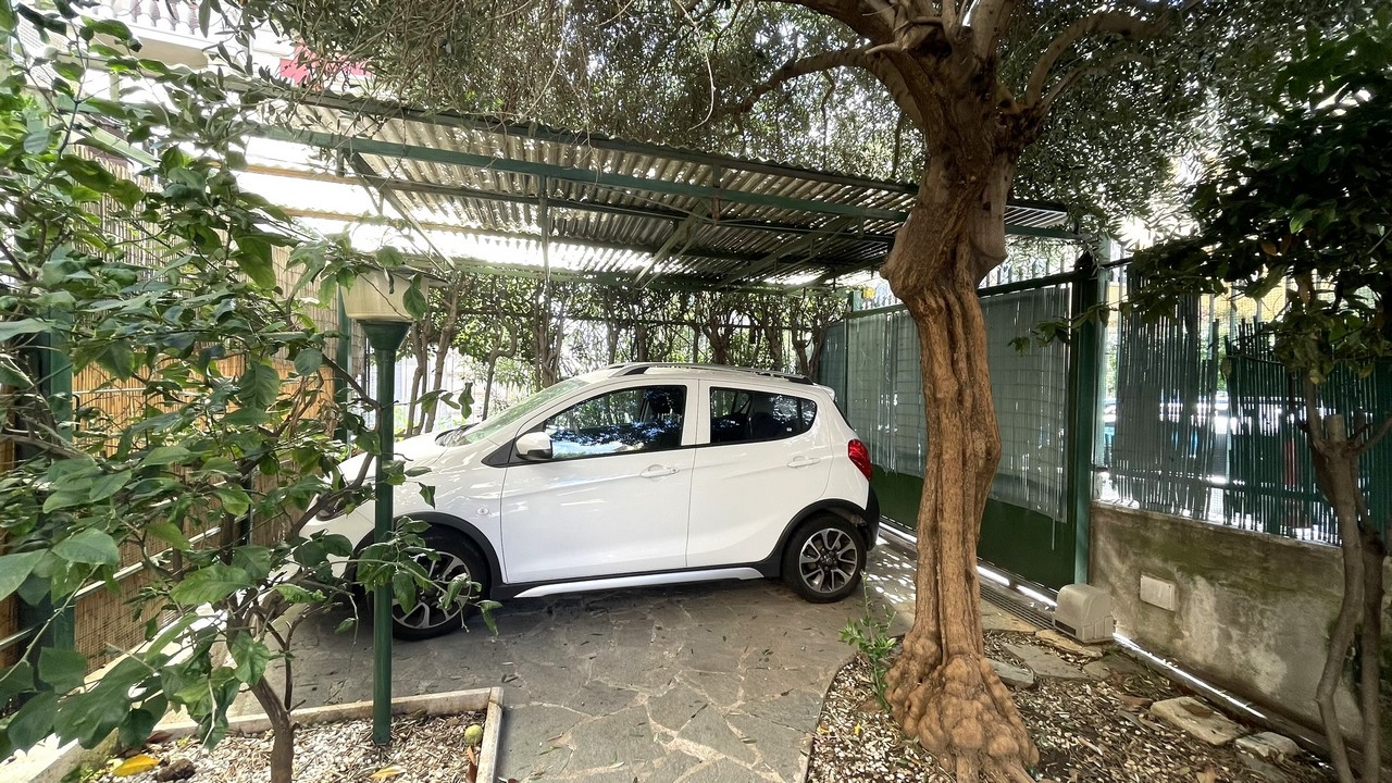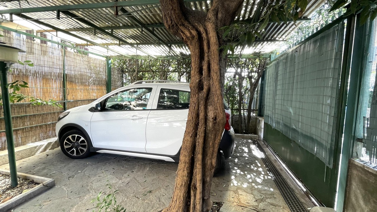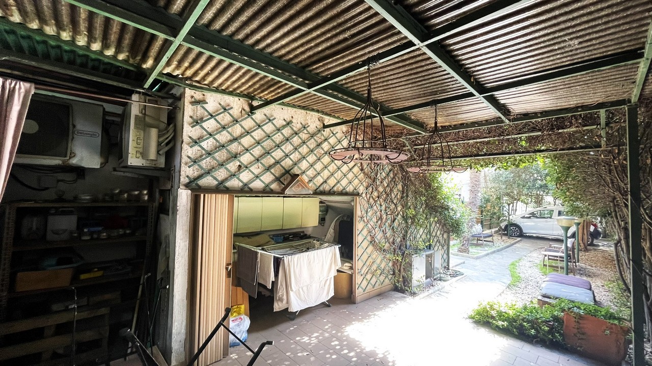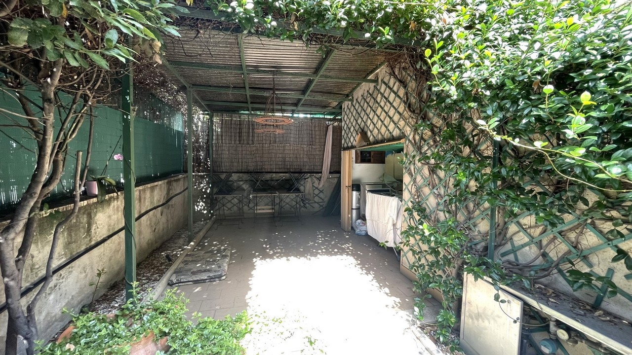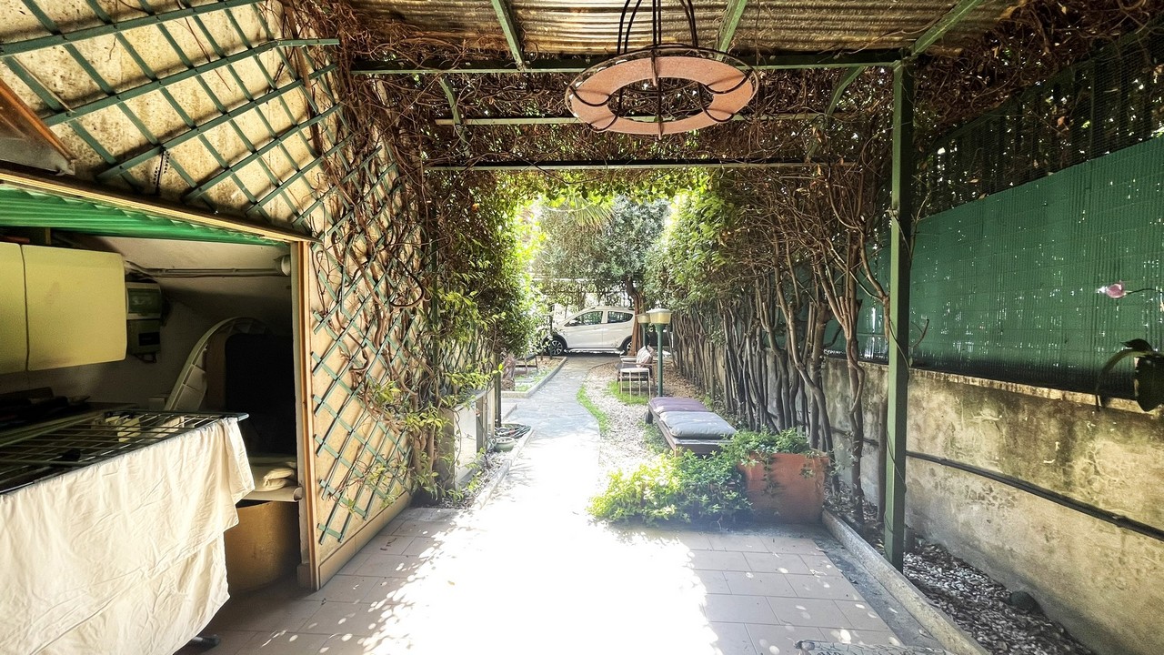Il grazioso giardino sottostante è di facile manutenzione, è dotato d’irrigazione per le aiuole laterali, ed una parte coperta da tettoia che garantisce privacy con pratica zona cucina/cambusa sottostante la scala d’accesso, per pranzi/aperitivi con gli amici anche in caso di tempo incerto: il passo carrabile è attivo.