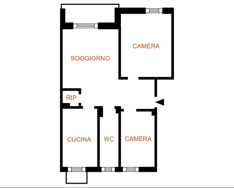 DESCRIZIONE INTERNI: ingresso aperto direttamente sulla grande sala con balcone, cucina abitabile anch’essa affacciata su altro balcone, due camere da letto, bagno completo e dispensa.