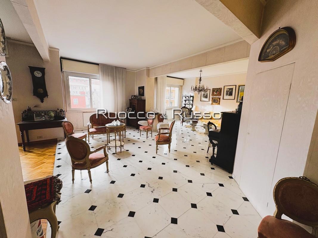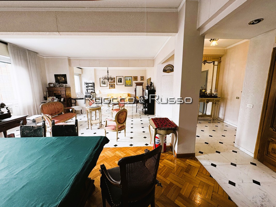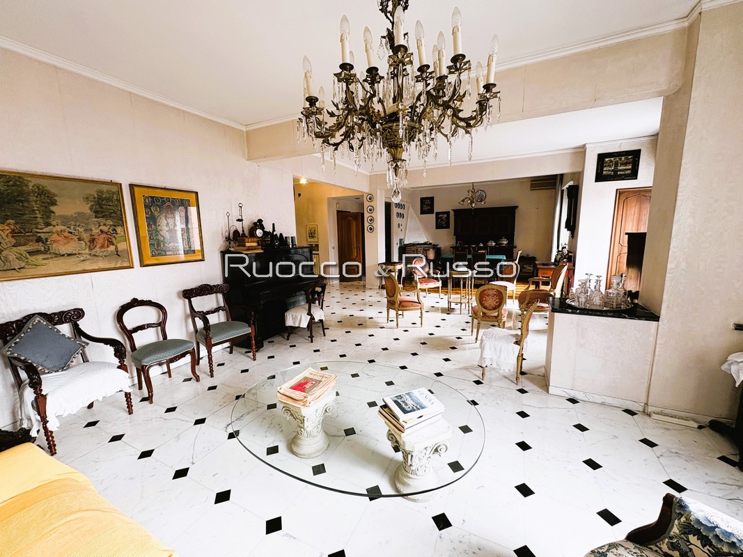 DESCRIZIONE INTERNI: grande abitazione divisa in zona giorno/notte. Zona giorno con ingresso direttamente collegato al grandissimo e scenografico salone triplo (volendo facilmente divisibile) affacciato sulla balconata, cucina abitabile attigua, bagno di servizio e due ampie dispense. Zona notte con tre camere da letto ed il bagno padronale, più balconcino di servizio. Le finiture sono molto ordinate.